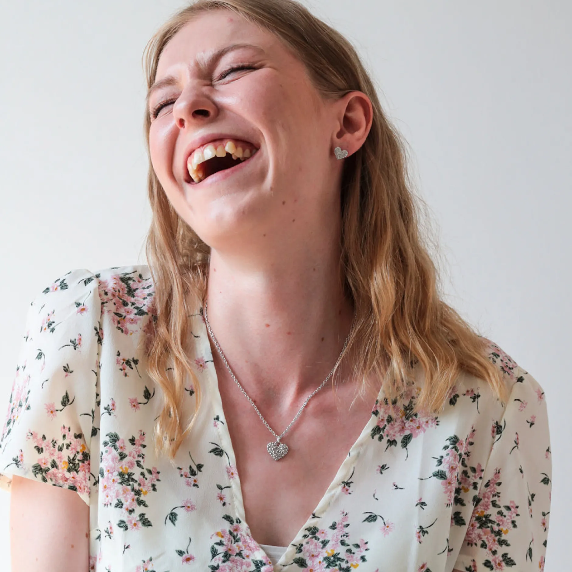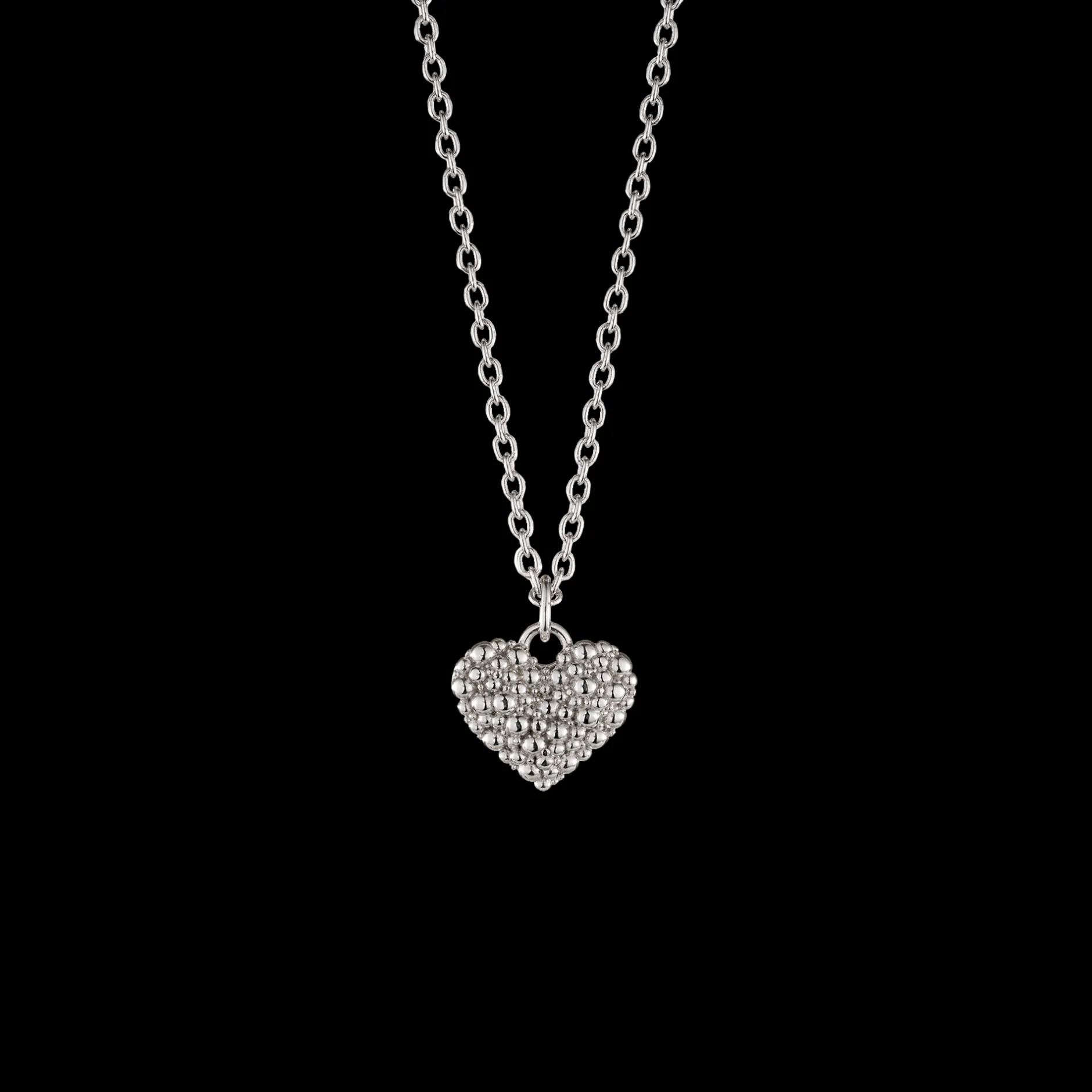 The heart-shaped necklace features interwoven small bubbles that lend a varying depth to its design.