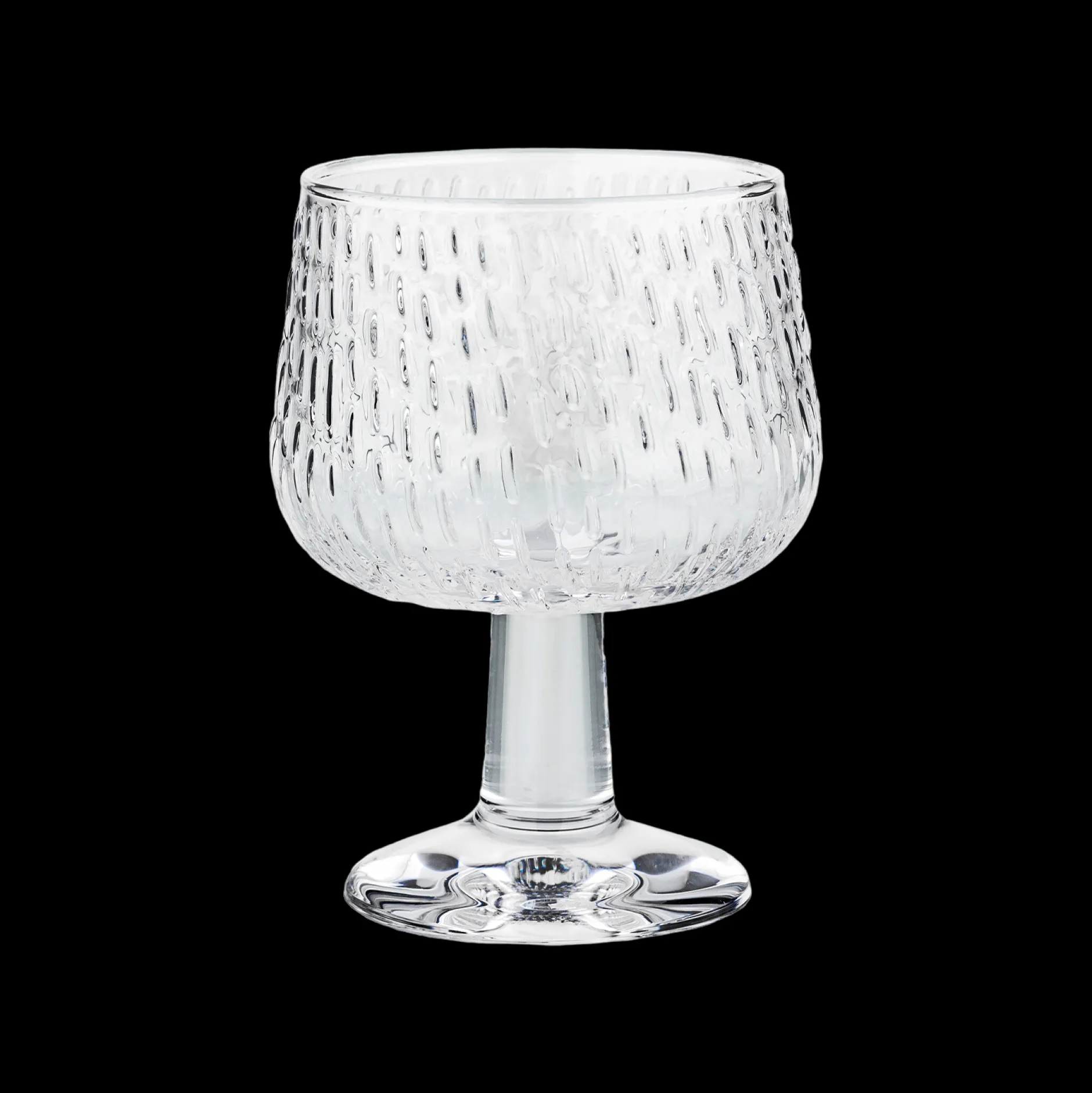 The Marimekko Syksy Clear Glass Goblet is crafted from hand-blown glass. Drawing inspiration from the Autumn season, the series was designed by Matti Klenell. This goblet is a work of art with a unique design. Its textured, clear glass surface makes it a classic addition to your Finnish glassware collection.