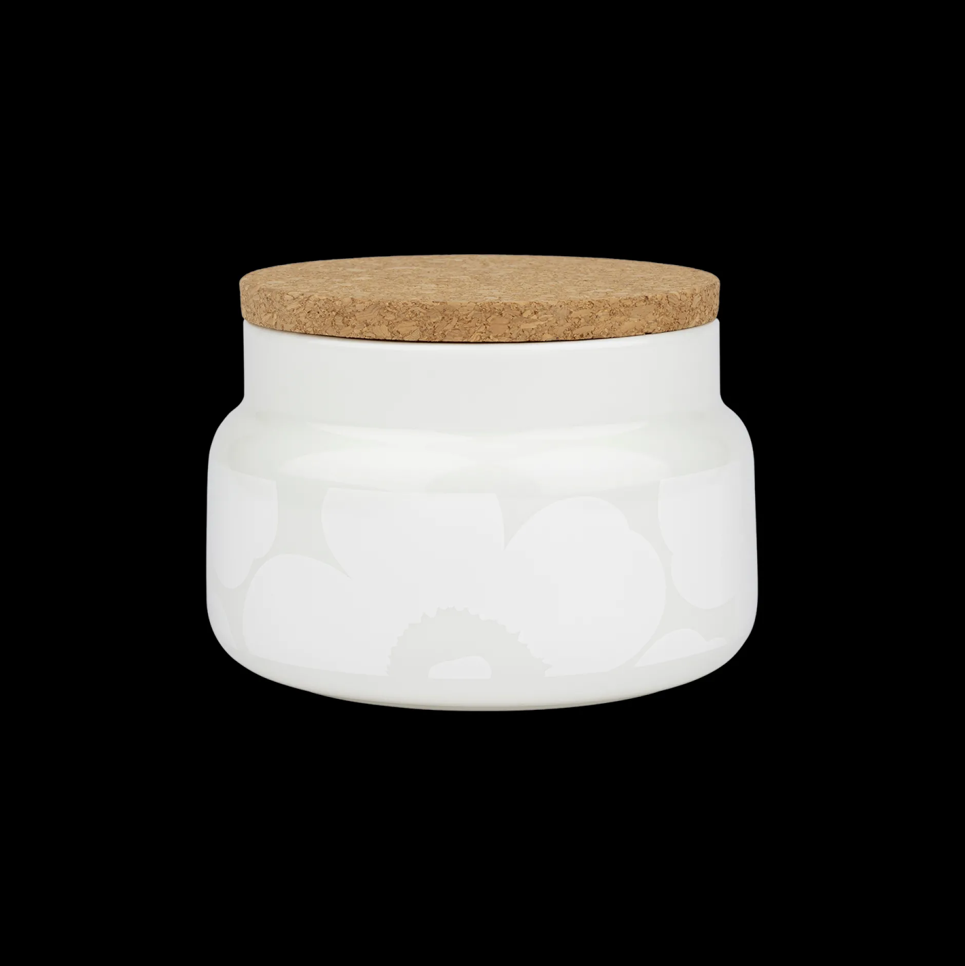 A soft nod to Marimekko’s most iconic pattern, the Unikko Small Jar in off-white and white brings quiet elegance to any space. Crafted from durable white stoneware and topped with a natural cork lid, this 17 oz. jar is both beautiful and practical. The subtle, tone-on-tone floral design by Maija Isola speaks to Unikko’s legacy—born from bold defiance in the 1960s and now a timeless symbol of creativity. Ideal for storing anything from tea leaves in the kitchen to keepsakes on your desk, it blends seamlessly into modern interiors while offering a touch of Finnish design history. The cork lid, stamped with the Marimekko logo, adds warmth and texture—just remember to wash it by hand.