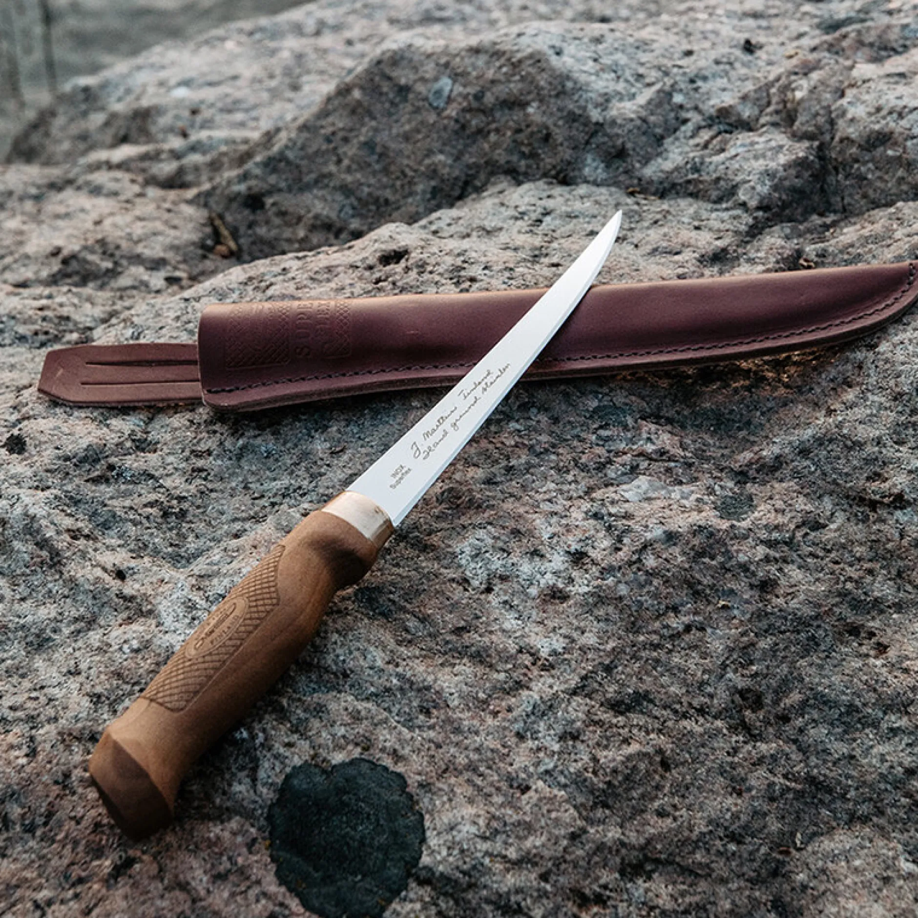 The 6″ stainless steel blade is more flexible than traditional fillet knives, making it ideal for delicate, detailed work. The handle is made from heat-treated Finnish birch, finished with a protective wax for durability. A laser-etched surface texture enhances grip—even when wet—ensuring comfort and control during long cleaning sessions.