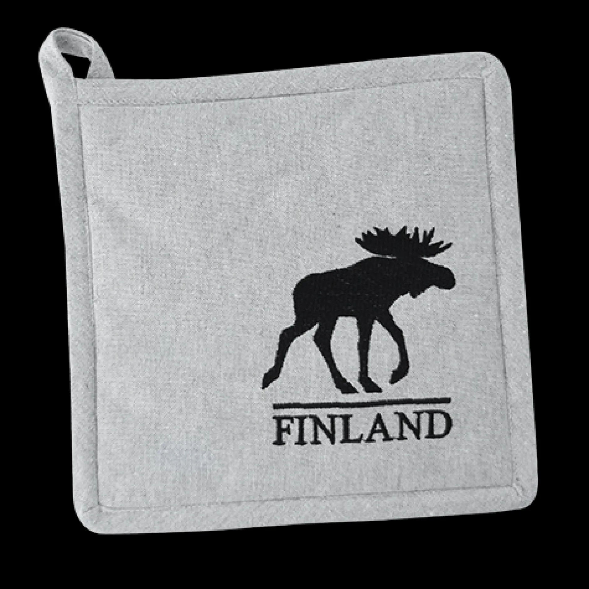 Eco-friendly, made from recycled materials, this light grey pot holder features an embroidered Moose and the word Finland on one side.
