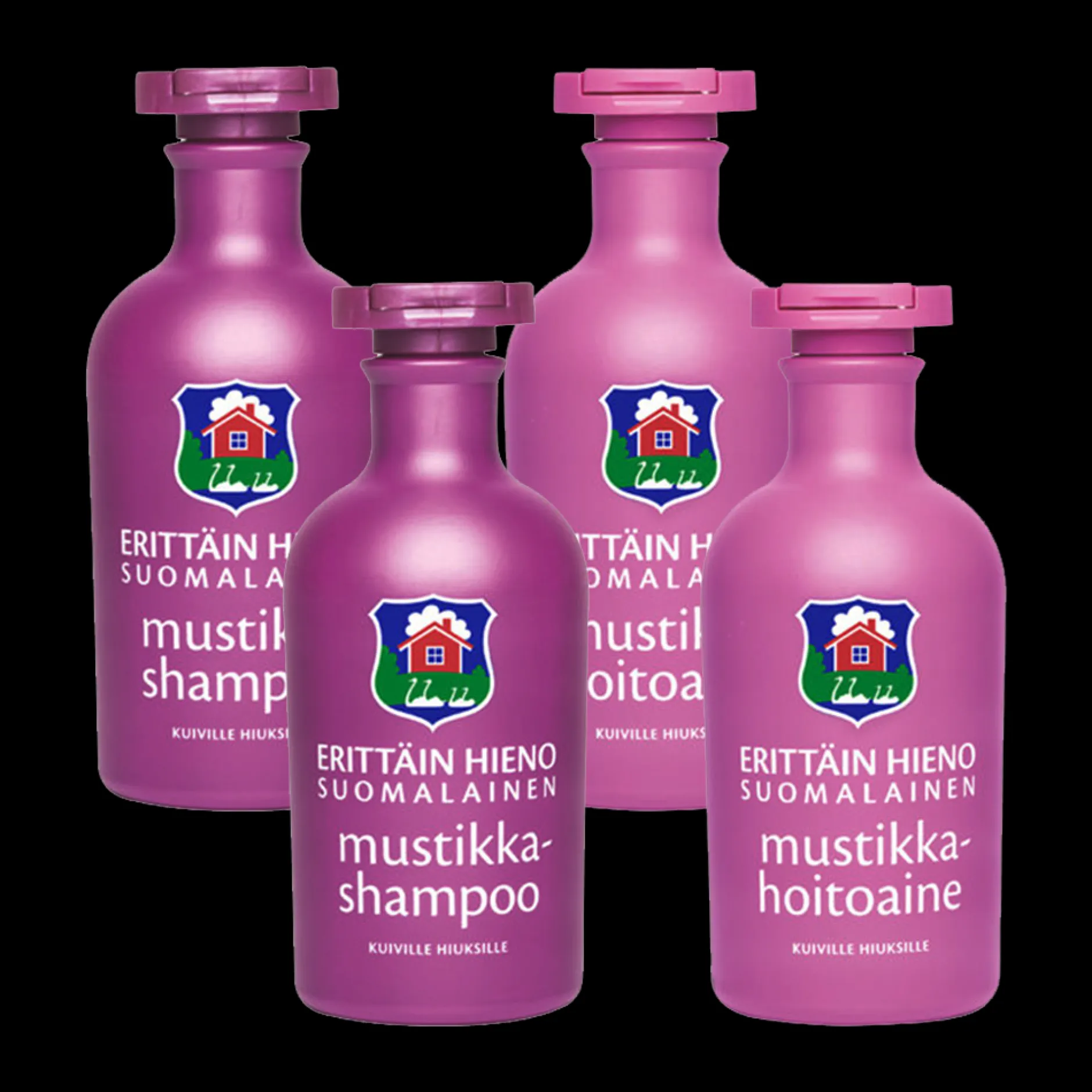 This pack contains (2) Blueberry Shampoo and (2) Blueberry Conditioner from the best-selling Very Fine Finnish company, Erittäin Hieno Suomalainen.