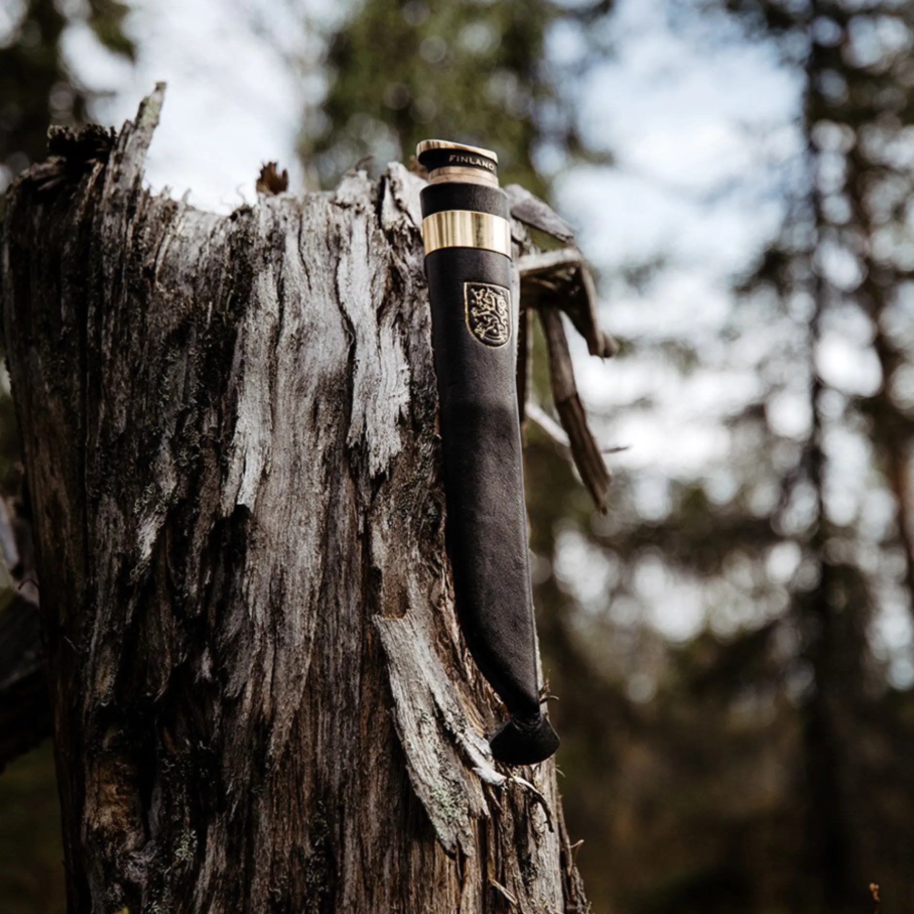 At the base of the handle sits the Finnish Lion, cast in bronze, representing strength and courage. The same iconic symbol is also printed on the black leather sheath. The handle is crafted from waxed curly birch, offering both beauty and a comfortable grip that ages gracefully over time. Each knife is one-of-a-kind, thanks to the natural variation of the wood grain.