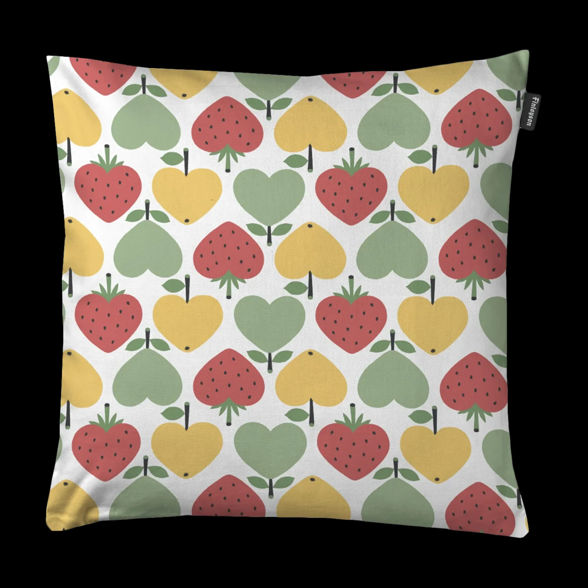 This Sydänhedelmät pattern of heart-shaped fruit cushion cover is a fabulously retro Finnish design. The print is identical on both sides and the back sports a zipper for effortlessly inserting an inner pillow of your choice.