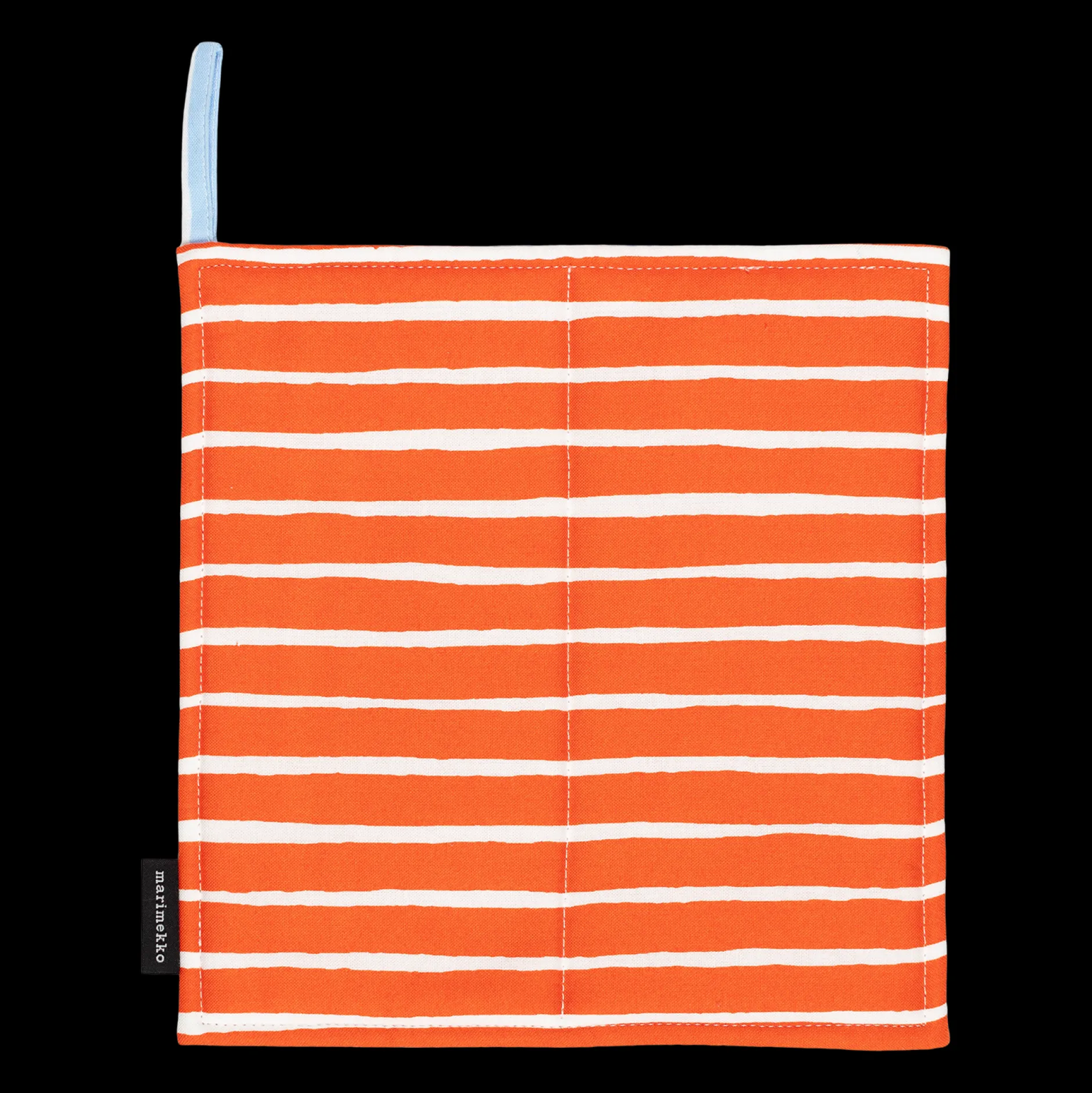 Add a splash of vibrant design to your kitchen with the Marimekko Piccolo Pot Holder. Featuring the bold, striped Piccolo pattern created by Vuokko Eskolin-Nurmesniemi in 1953, this pot holder is made from organic cotton and printed in Helsinki. It offers both style and functionality with padded filling for heat protection and a convenient hanging loop for easy storage. Designed to bring a touch of timeless Finnish design to your home, this pot holder is machine washable and a perfect blend of beauty and practicality.
