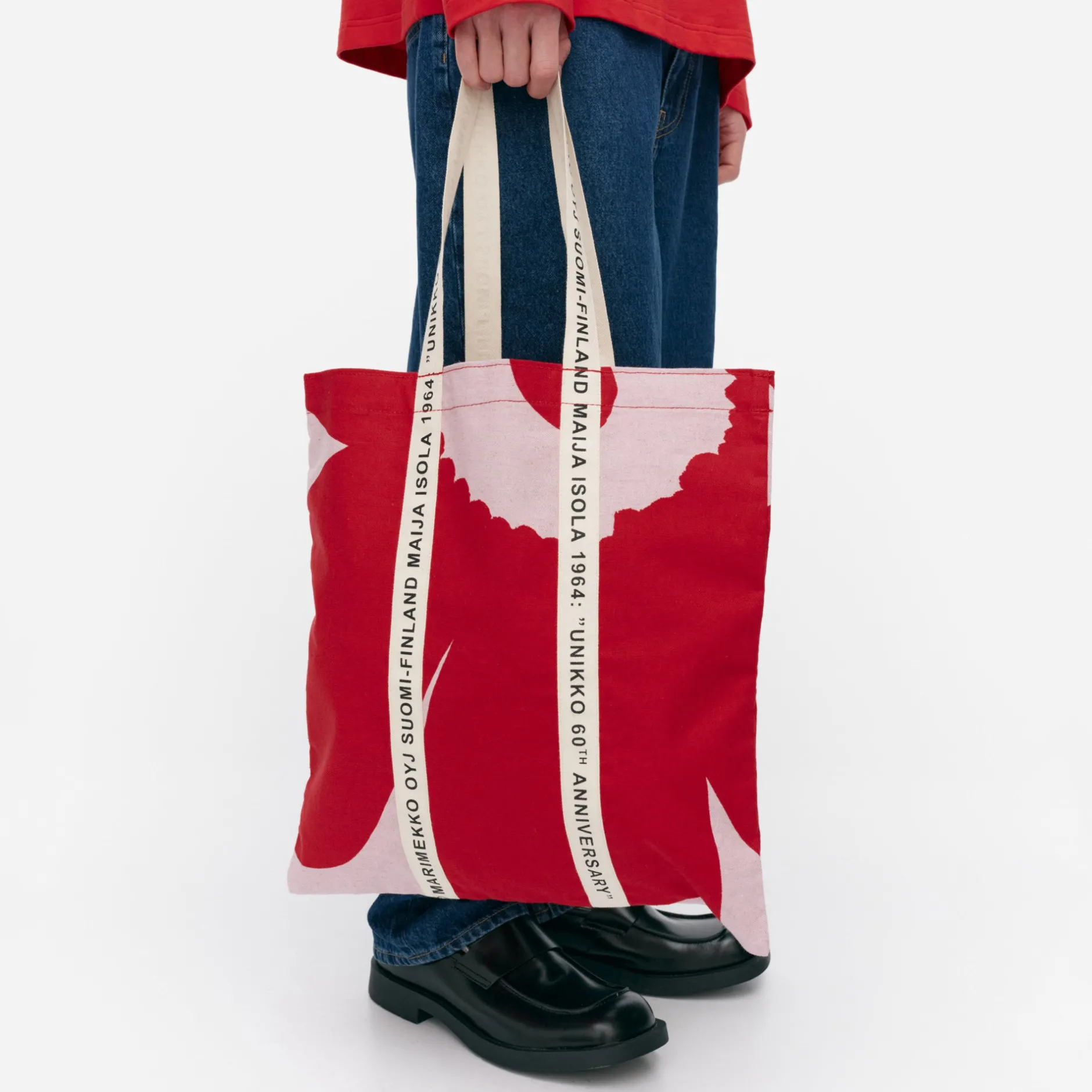 Celebrate style and sustainability with the Marimekko Unikko Carrier Midi Kioski Bag, crafted to mark the 60th anniversary of the iconic Unikko pattern. Made from an unbleached cotton and linen blend, this tote features a striking large Unikko flower on fabric expertly printed in Helsinki. The tote’s handles are accented with “Unikko 60th anniversary” printed cotton straps that run along the sides, adding a unique touch to its design.