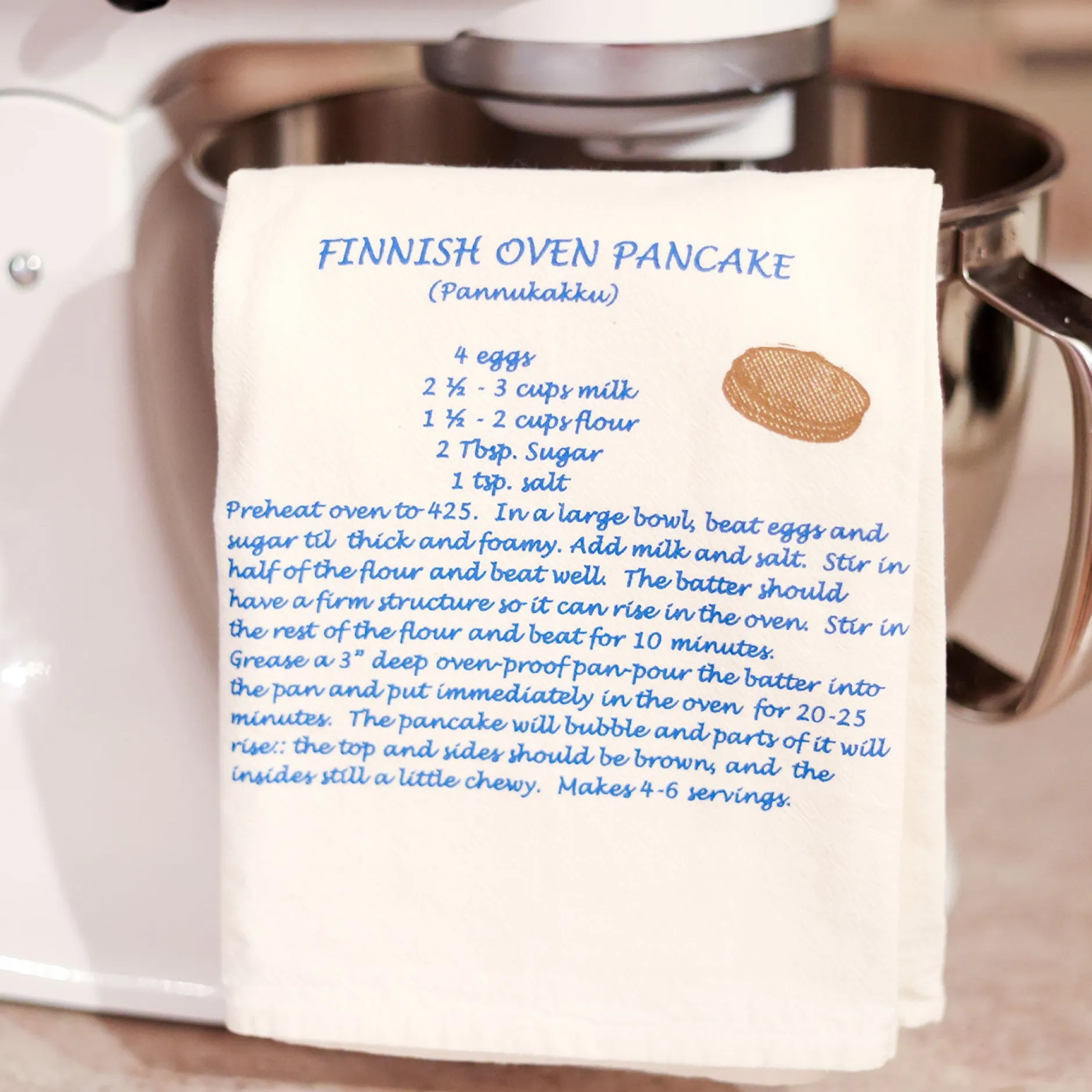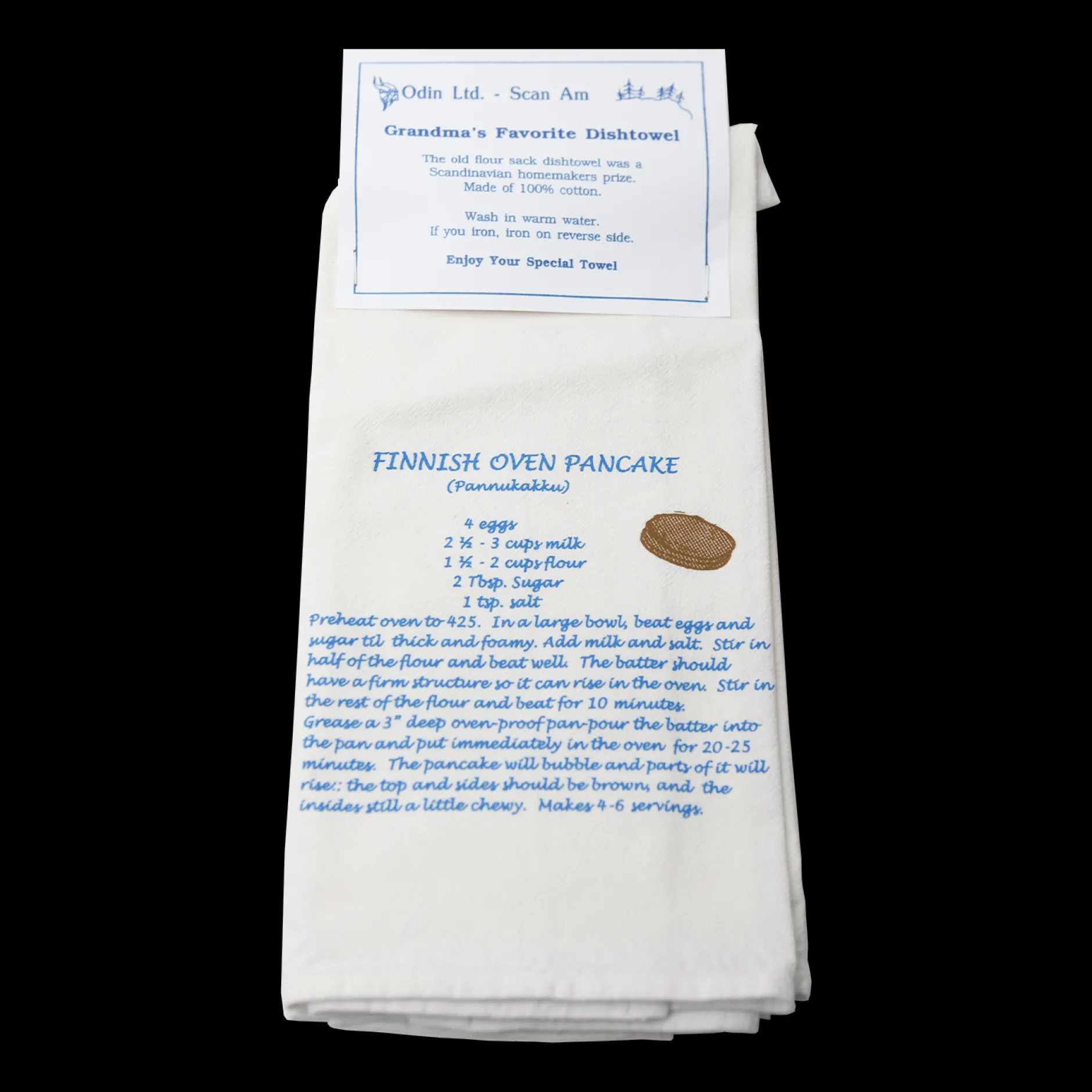 Finnish Grandmas and Moms loved old flour sack dishtowels so much it was considered a Scandinavian homemakers prize. Our Finnish Oven Pancake flour sack dishtowel is made of 100% cotton. Wash in warm water. If you iron, iron on reverse side of print. Enjoy your special Finnish towel.