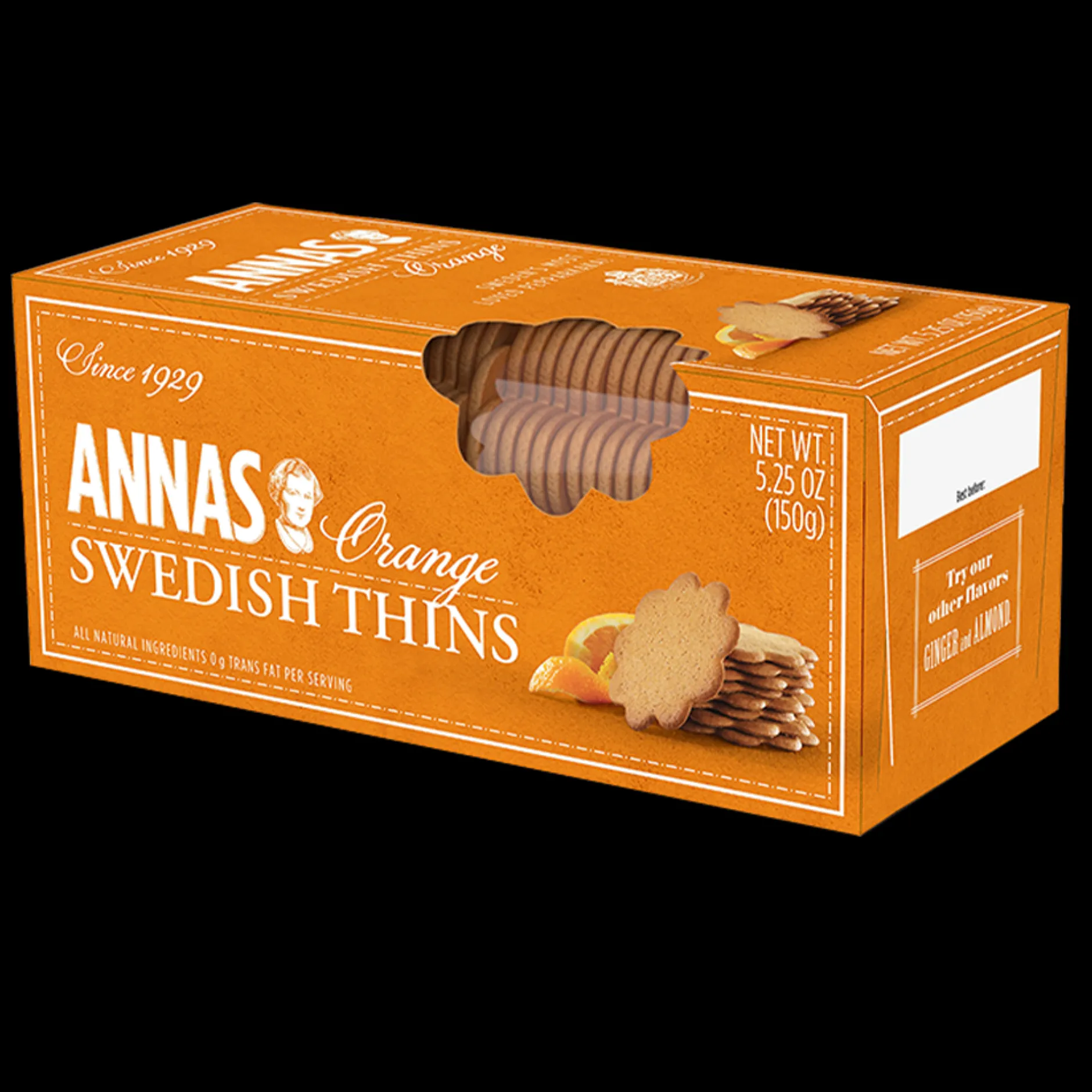 Satisfying by themselves, Anna’s Orange Thins are Swedish cookies that also are a perfect pairing for cheese and fruit. Anna’s Swedish Thins make a scrumptious crumble for pie crust and ice cream topping. These Swedish cookies have a distinctive fresh orange flavor. Each box of cookies contains approx. 32 pieces.