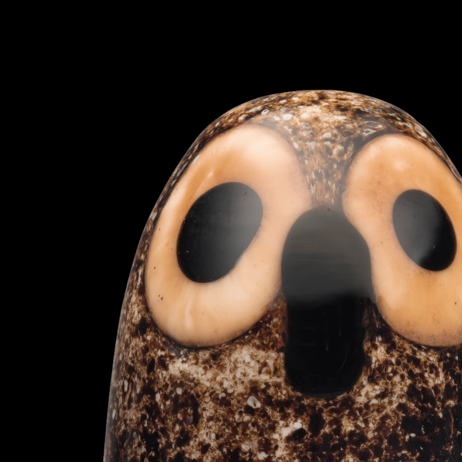 Delightfully small yet brimming with character, the iittala Toikka Little Barn Owl is a charming interpretation of one of nature’s most enigmatic birds. Designed by the legendary Oiva Toikka, this handblown glass creation captures the barn owl’s quiet curiosity with its timid yet inquisitive gaze. Its wide, pale yellow eyes gaze out from above a subtly elevated black beak, while a pattern of densely speckled brown tones enhances its intricate texture and depth.