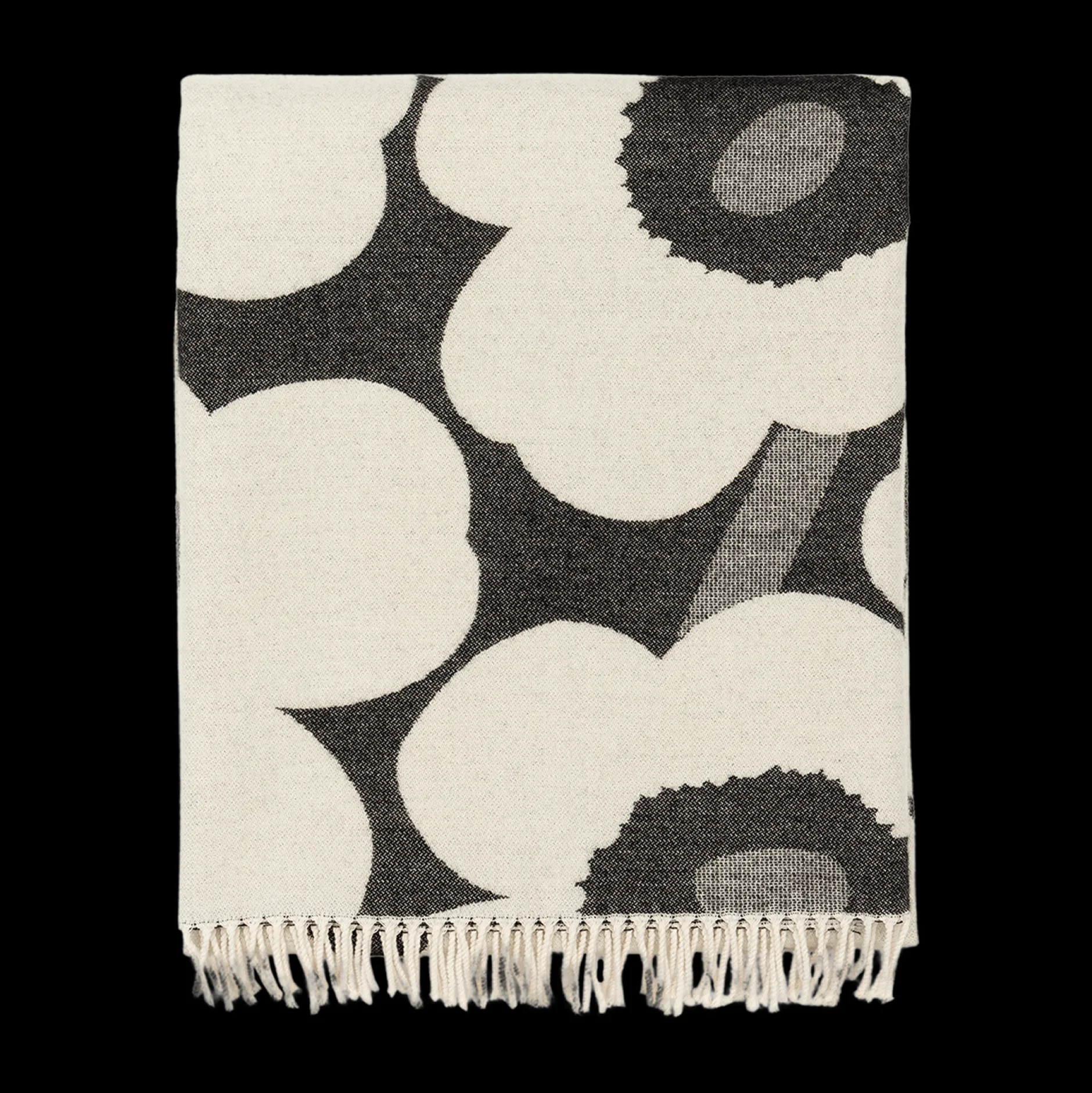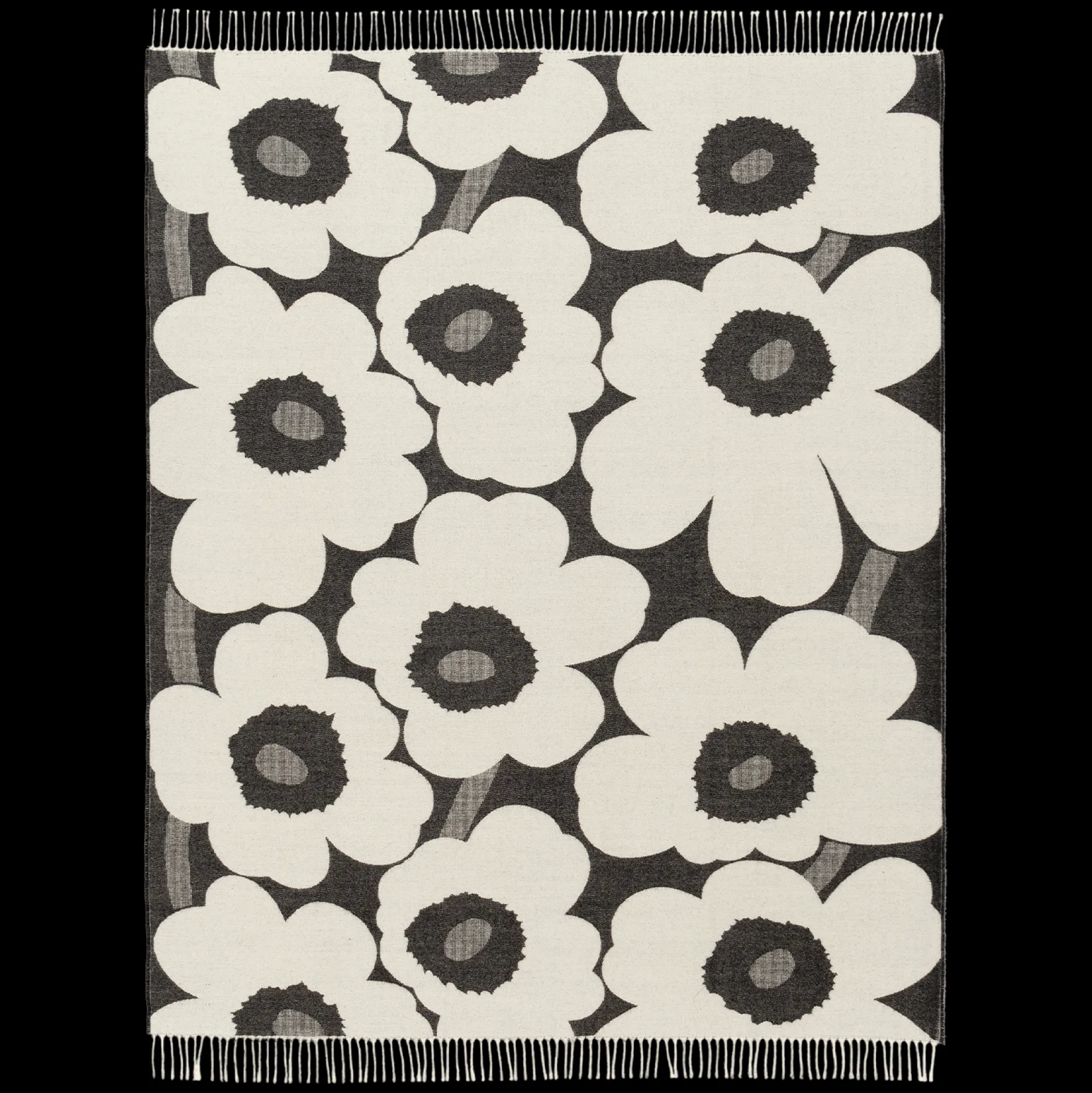Wrap yourself in comfort and creativity with the Marimekko Unikko Blanket in off-white and charcoal. Woven with a luxurious blend of certified wool and organic cotton, this soft jacquard blanket features Maija Isola’s iconic Unikko (poppy) design—an enduring symbol of bold, imaginative thinking since 1964. The blanket showcases a striking two-sided design, with a reversed color scheme on the back for added visual interest. Fringed edges lend a classic finish, making it perfect for draping over a sofa, armchair, or the end of a bed. Whether you’re curling up with a book or adding texture to your home decor, this blanket brings timeless style and cozy warmth in equal measure.