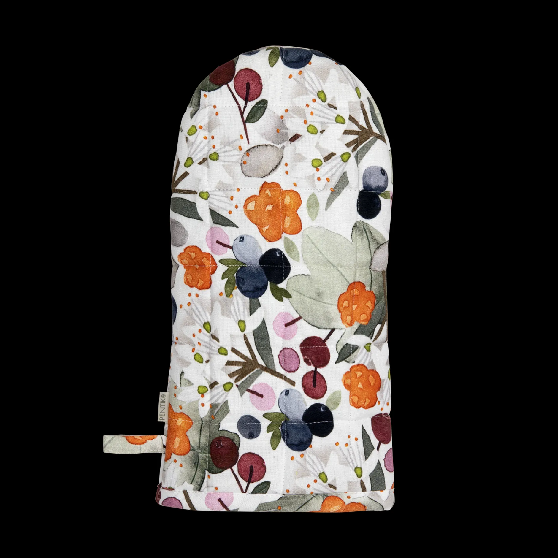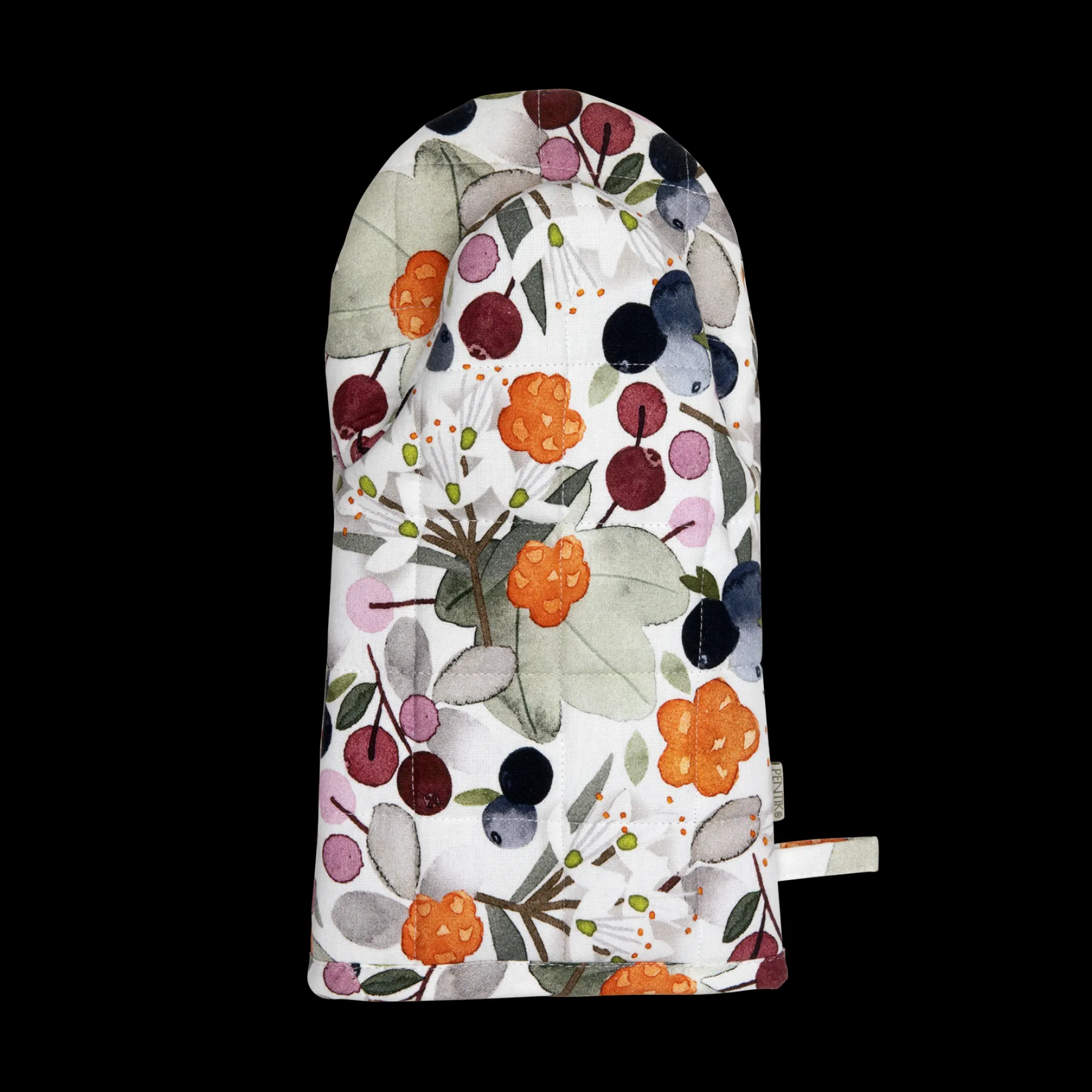 Pentik’s Metsämarja Oven Mitten, designed by Lasse Kovanen, celebrates the enchanting allure of wild berries. With a watercolor motif, this collection beautifully represents the lush forests of Northern Finland, home to an abundance of cloudberries, cranberries, and blueberries, as well as the delicate foliage of the cloudberry and blooming marsh tea. The checkered quilted stitching enhances the flexibility, ensuring a safe grip when handling hot dishes.