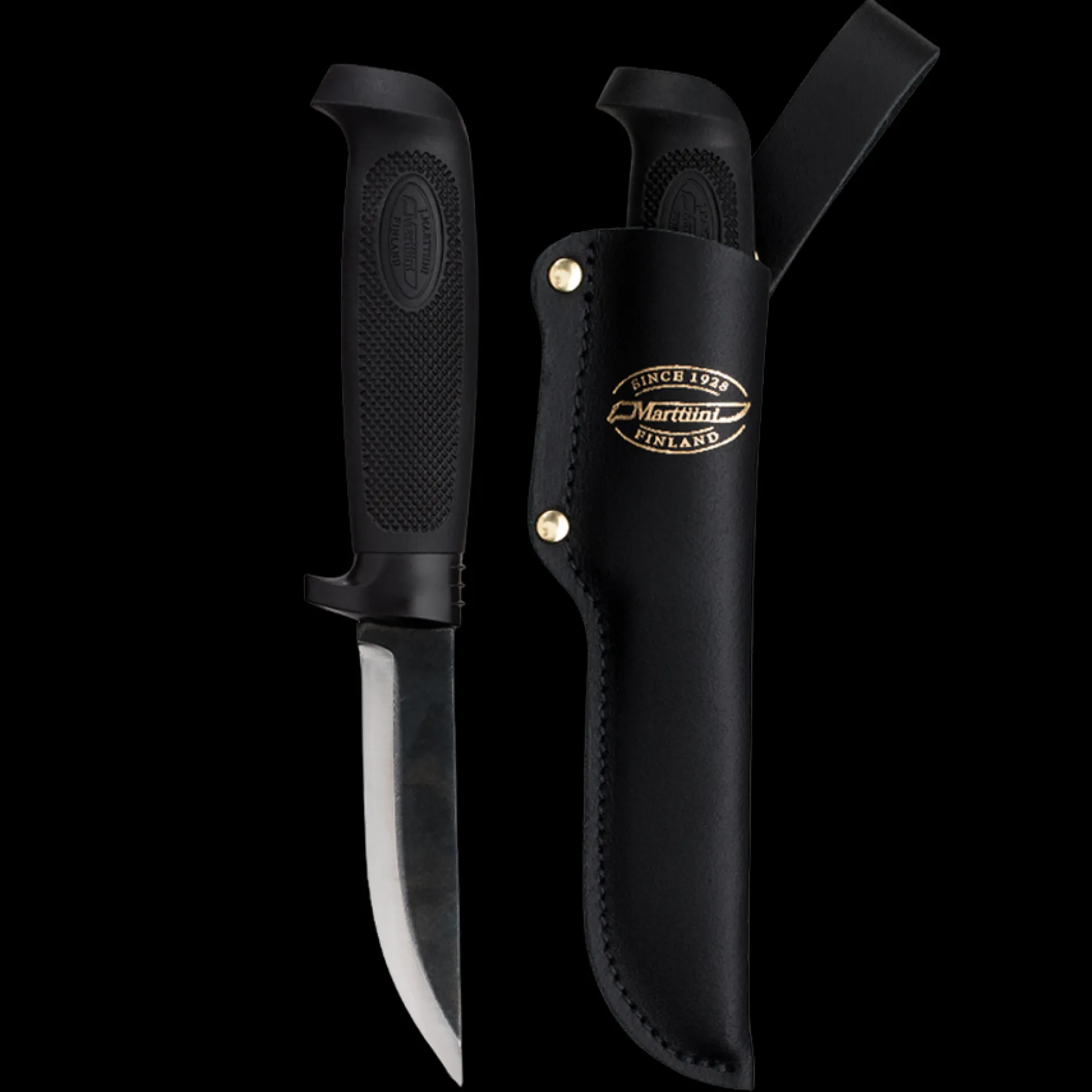 Its textured black rubber handle, combined with a protective finger guard, ensures a secure grip even in cold or wet conditions. A durable black leather sheath adds a classic touch while keeping the knife safely stowed when not in use.
